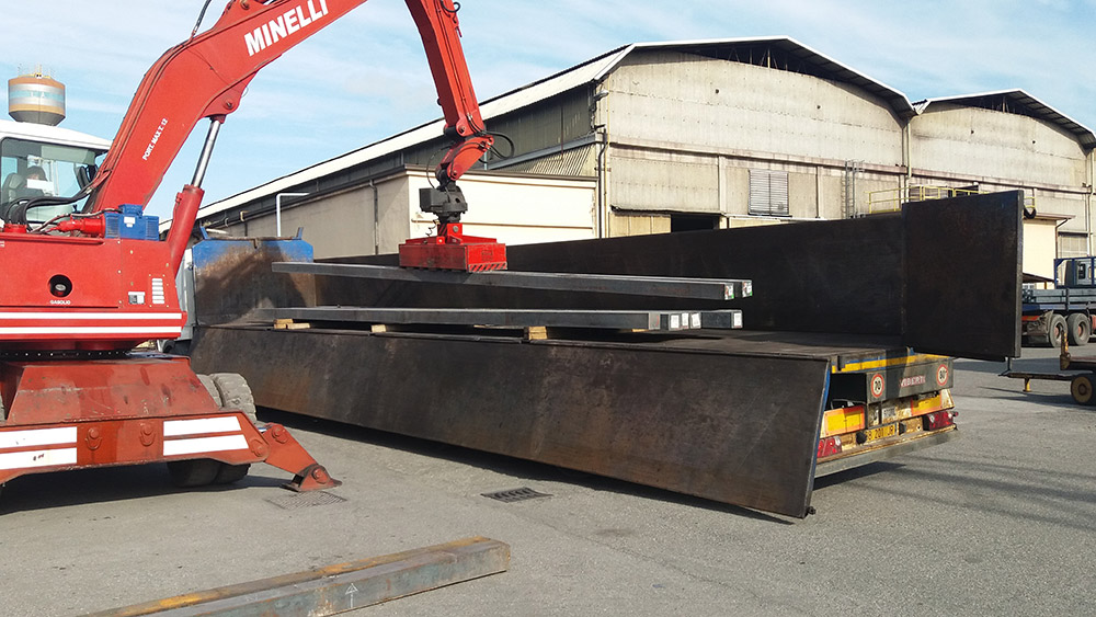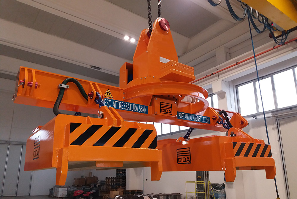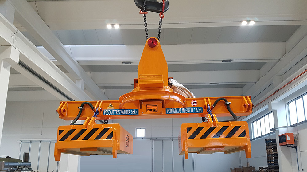 Per il sollevamento magnetico di lamiere, billette o bramme è possibile richiedere la versione con magneti elettropermanenti, a basso consumo energetico, per evitare il rischio di distacco del carico per guasti sull'impianto elettrico o mancanza di rete.